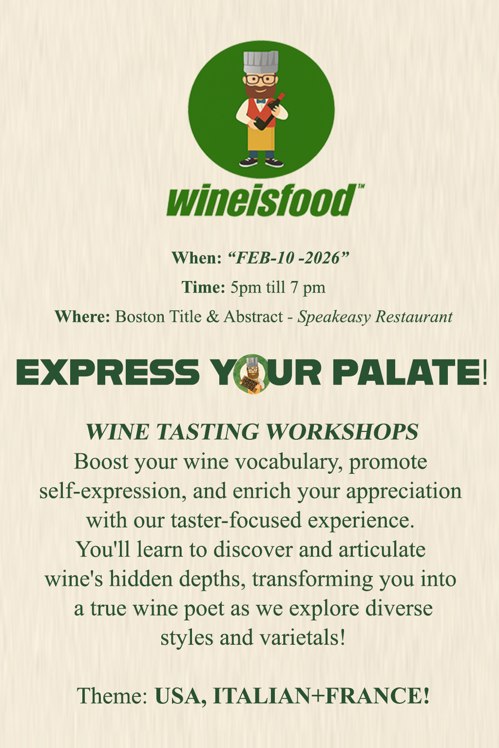 WiNEisFOOD proudly partners with Boston Title & Abstract, a one‑of‑a‑kind event venue in Oklahoma, where our experiences are hosted on Sundays, Mondays, and Tuesdays.